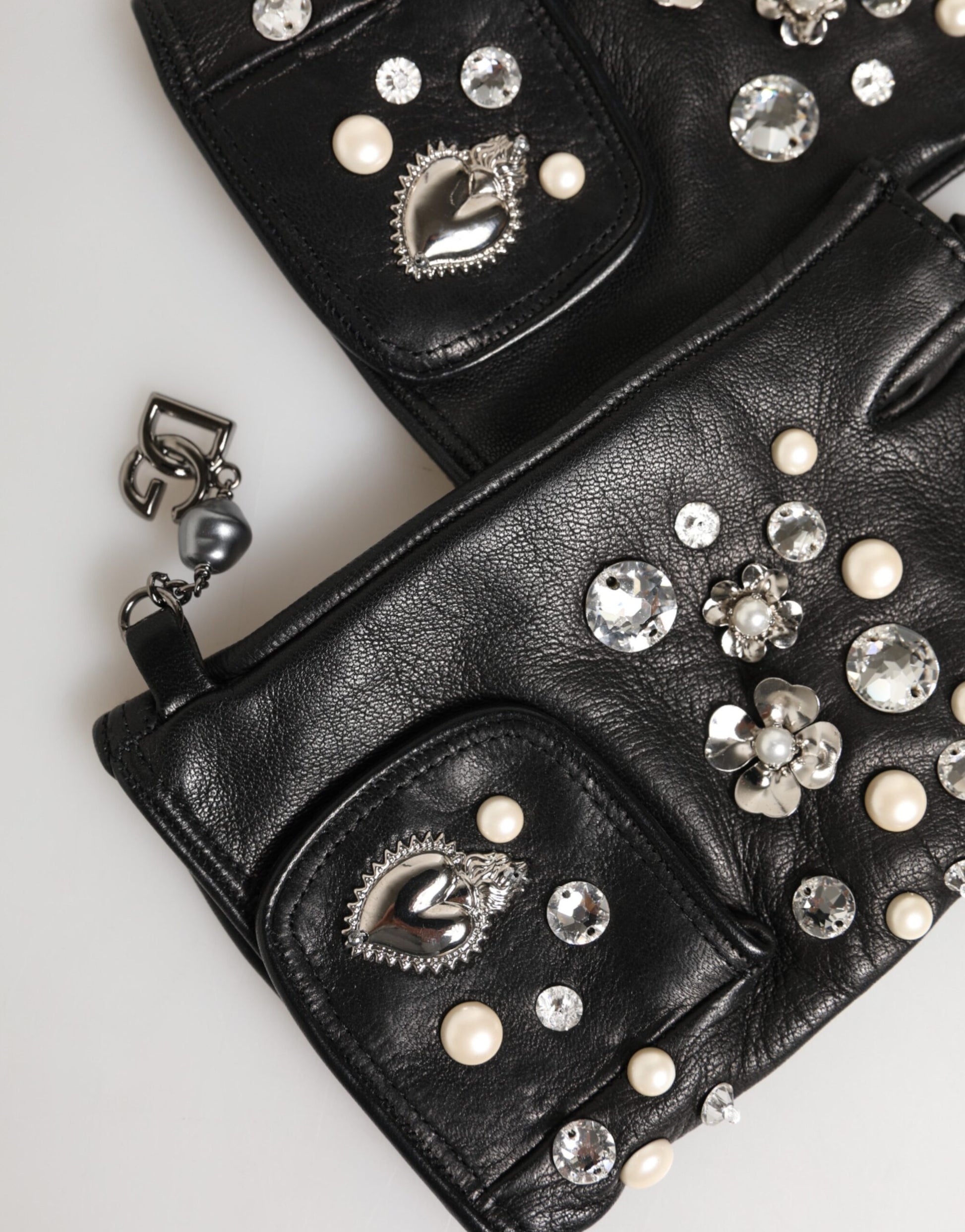 Handschuhe mit Logo in Handgelenkslänge — Diese eleganten, schwarzen Handschuhe in Handgelenkslänge sind mit raffinierten Verzierungen versehen, die einen Hauch von Glamour verleihen. Sie sind meisterhaft gefertigt und verkörpern die perfekte Mischung aus Luxus, Stil und italienischer Handwerkskunst, für die DOLCE & GABBANA bekannt ist.